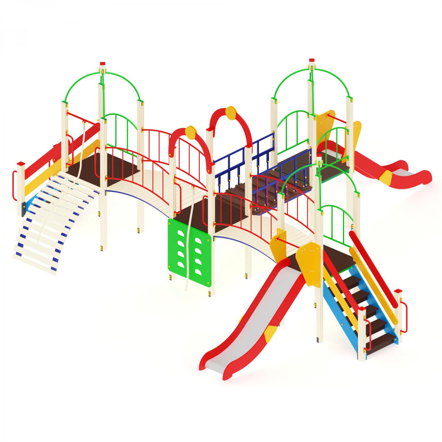 Детский комплекс состоит из: лаза, подвесной моста, каната, 2 дугообразных моста, лестницы, щит скалолаз, 2 скат горки, 4 башни.
